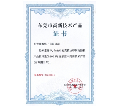 東莞市高新技術(shù)產(chǎn)品證書(光模塊印制電路板產(chǎn)品)